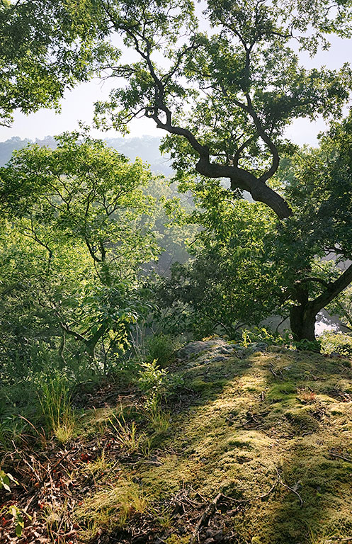 The Point is the high spot on our ridge, about 100 feet above Hillers Creek at the Prairie Garden Trust. The north slope stays cool, so the rock holds a soft moss carpet; the face below it has dozens of different kinds of ferns.