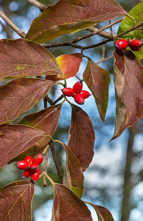 Fall is coming on. Wild fruits are showing up, including the bright red fruit of flowering dogwood. They are inedible for us, but birds get to them fast.